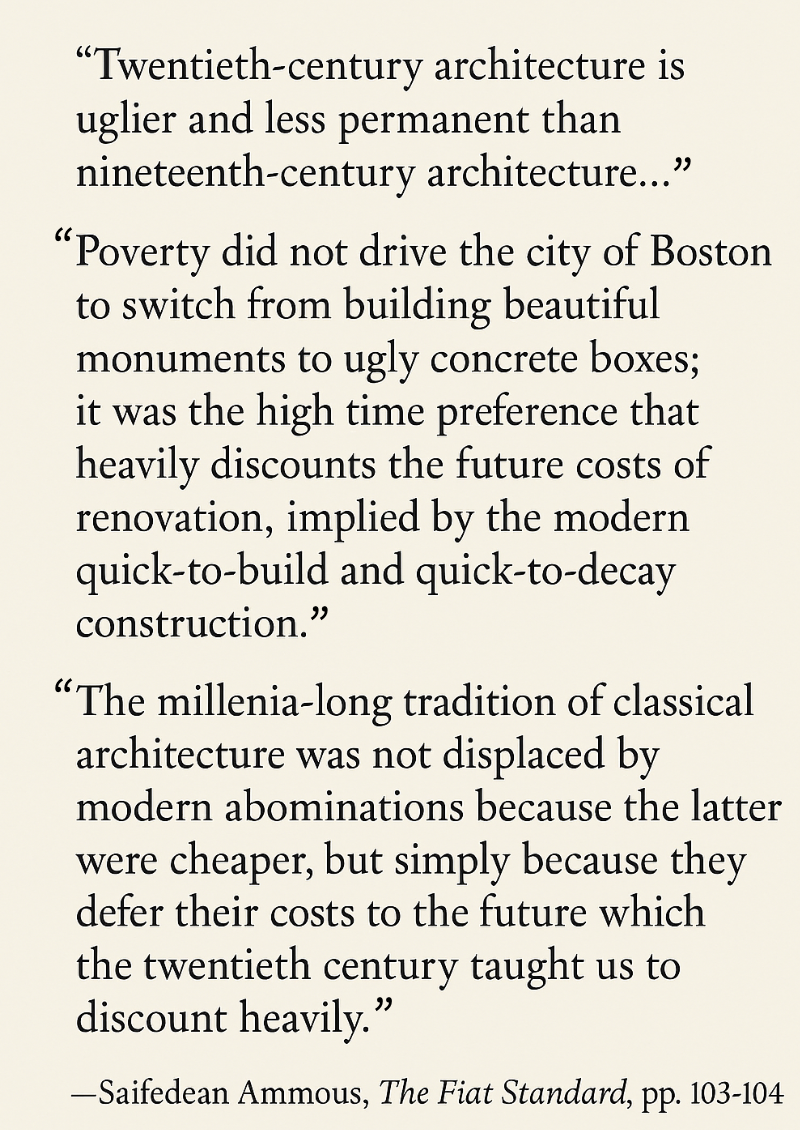 He focuses on discussing how the fiat standard has led to the construction of uglier and inferior buildings. The craft of architecture has essentially degraded under this system, he argues.[2]